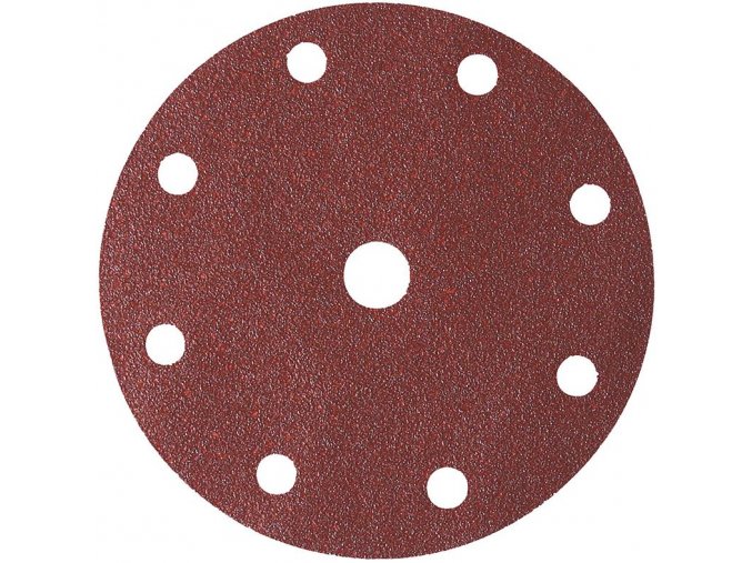 Kruhový papírový brusný výsek se suchým zipem o průměru 150, zrnitost P24 - P400, 8 děr o průměru 10mm na rozteči 120mm + 1 středový otvor 17mm.