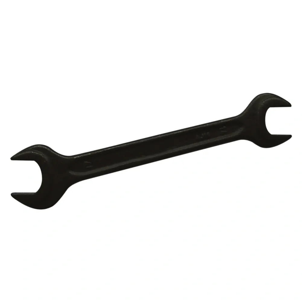 Oboustranný maticový klíč s černěným povrchem. Profilované tělo, otevřené ploché čelisti.