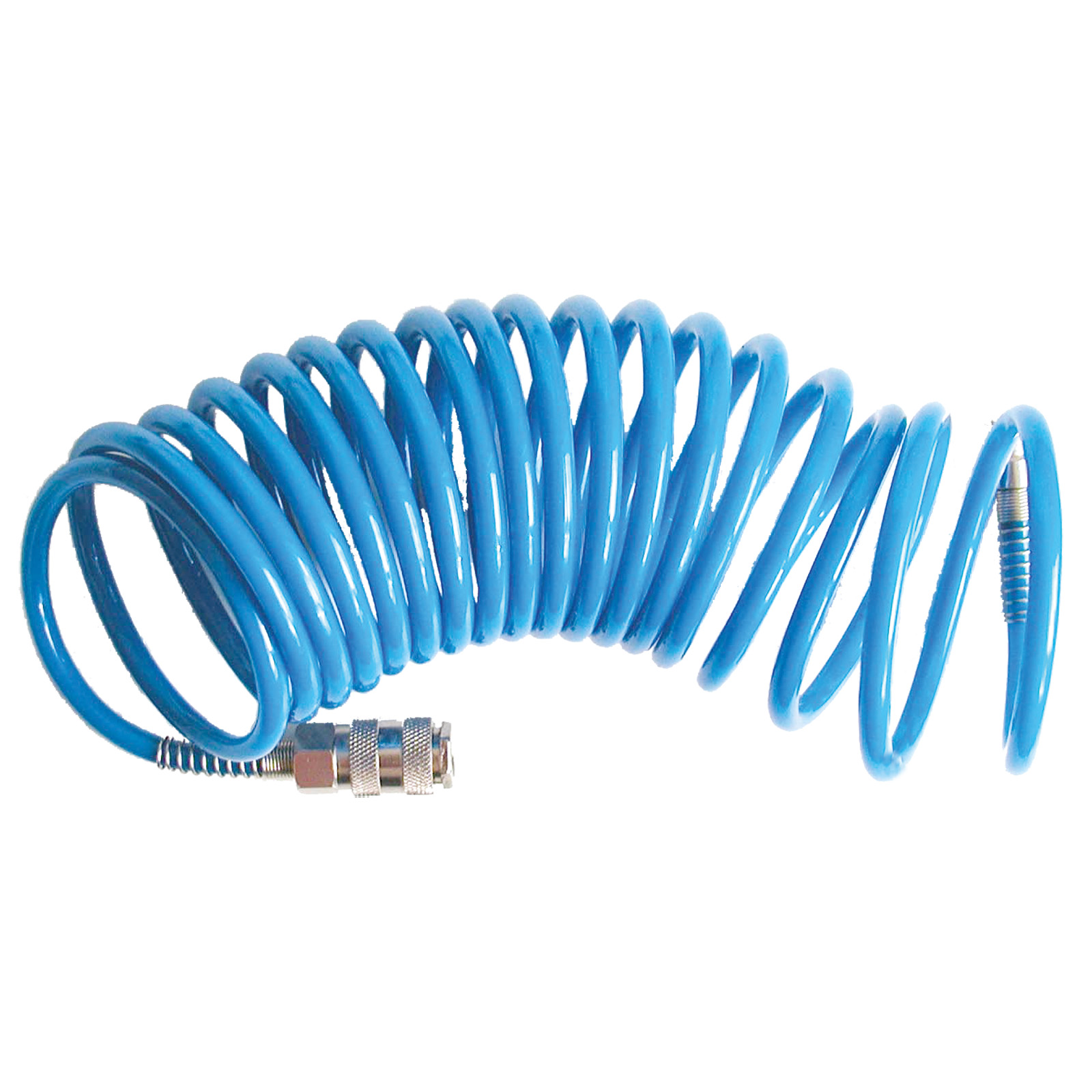 Hadice na kompresor spirálová osazená rychlospojkami pro rychlou a snadnou montáž. Vhodná pro připojení ofukovací pistole a stříkací techniky.Velmi pružný materiál odolný proti prasknutí či zlomení. Spirálový tvar je skladný a praktický při práci. Maximální pracovní tlak hadice je 10 bar. Pružný materiál PU odolný proti prasknutí.